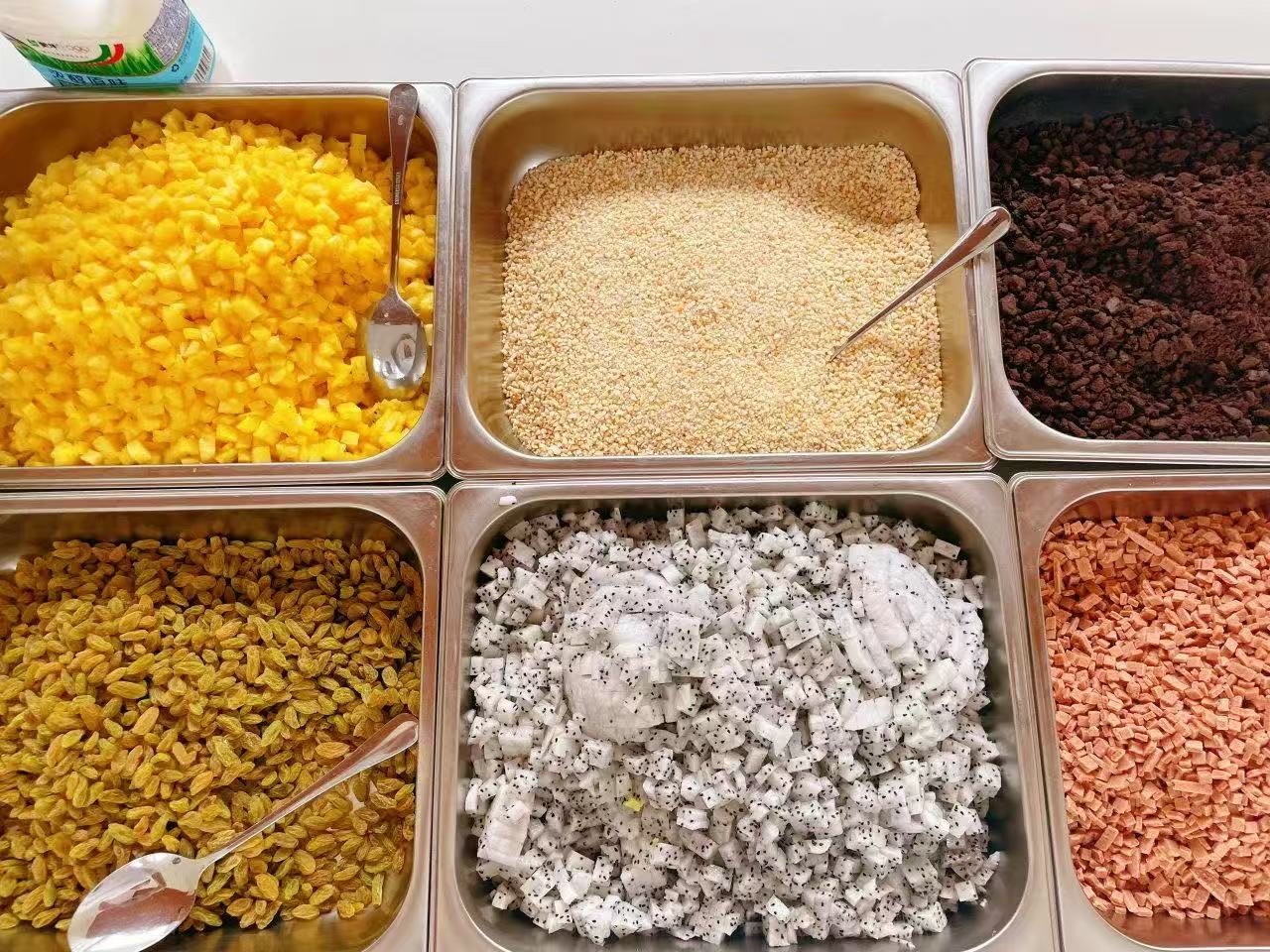 К пельменям прилагался ряд разноцветных начинок, которые не только придавали сладость пельменям, но и оживляли все мероприятие. Дробленый арахис и кишмиш придали пельменям богатую текстуру, и в каждом кусочке чувствовалось идеальное сочетание хрустящей и мягкой корочки, а добавление ананаса и драконьего фрукта придало пельменям именно то количество сладости, которое необходимо для удовлетворения вкусовых потребностей разных людей. Свежесть йогурта, вкус боярышника и сладость дробленого Oreo - эти уникальные вспомогательные ингредиенты придали пельменям еще больше сладости.